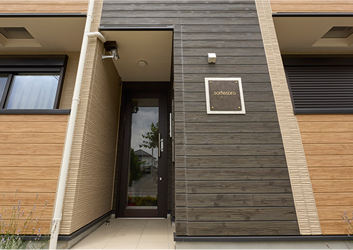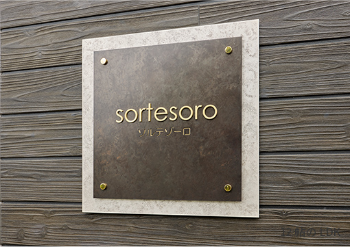 施主様こだわりの館銘板は品のある白と茶色のコントラスト、金色の化粧ビスが印象的なデザインです。