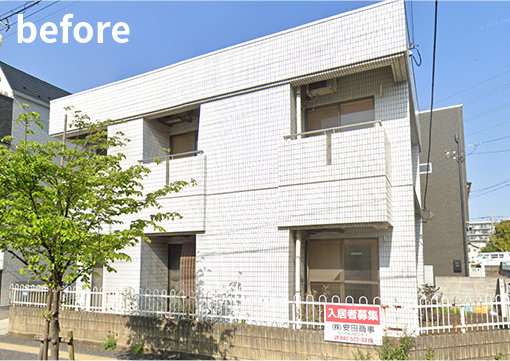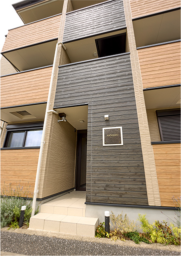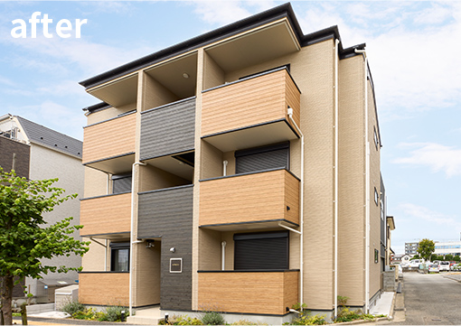 昭和62年に建てられた2階建て1R6戸のアパートのリフォームを検討されておりましたが、リフォーム費用が高額で各戸16㎡という狭小間取りだったこともあり、将来的に幅広い入居者に永く住んでいただけるよう木造3階建て1LDK6戸のアパートへ建替えを行いました。戸数は建て替え前と変えることなく、居住スペースを広く確保するためにエントランスなどの共用部分の配置を工夫しています。