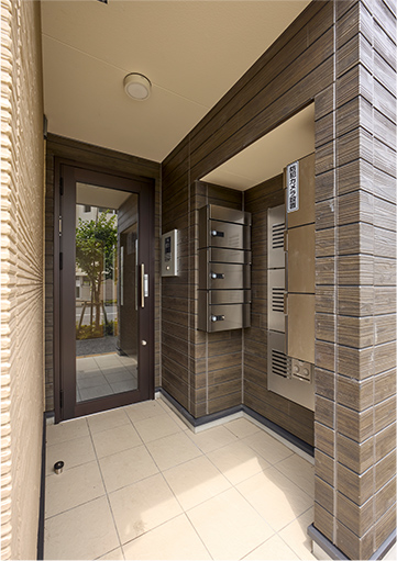 柔らかな色味のアパート全体に高級感を与え、外観や街並みに彩りを添えています。