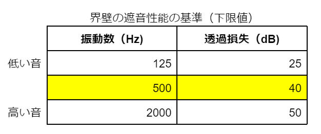「透過損失」とは、音が壁によってどれくらい弱くなったかを表したものです。例えば、500Hzの高さで80dBの大きさの生活音が、隣戸で40dBの大きさで聞こえる分には、基準をちょうどクリアしているということになります。