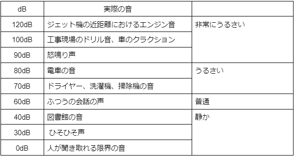 音の大きさを実際の音を例としてまとめたものが、以下になります。